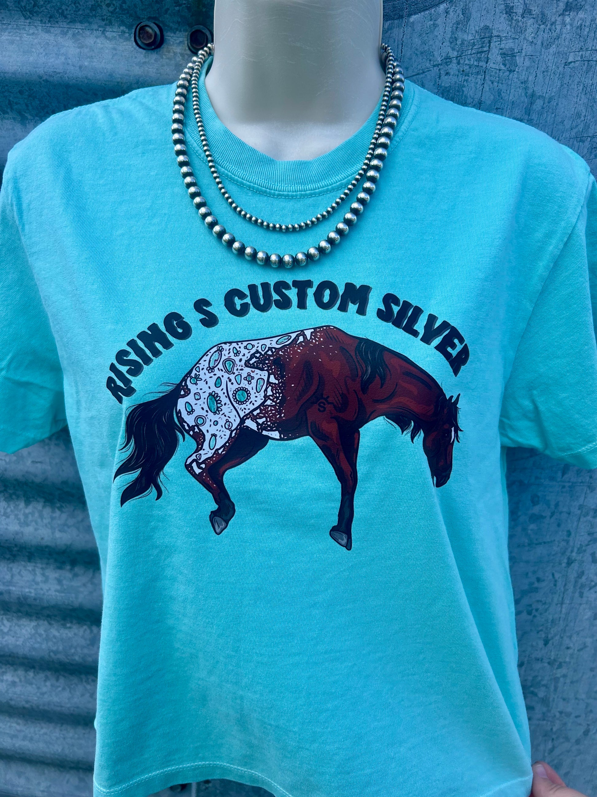 Rising S logo graphic printed on a Comfort Colors tee in bright blue.