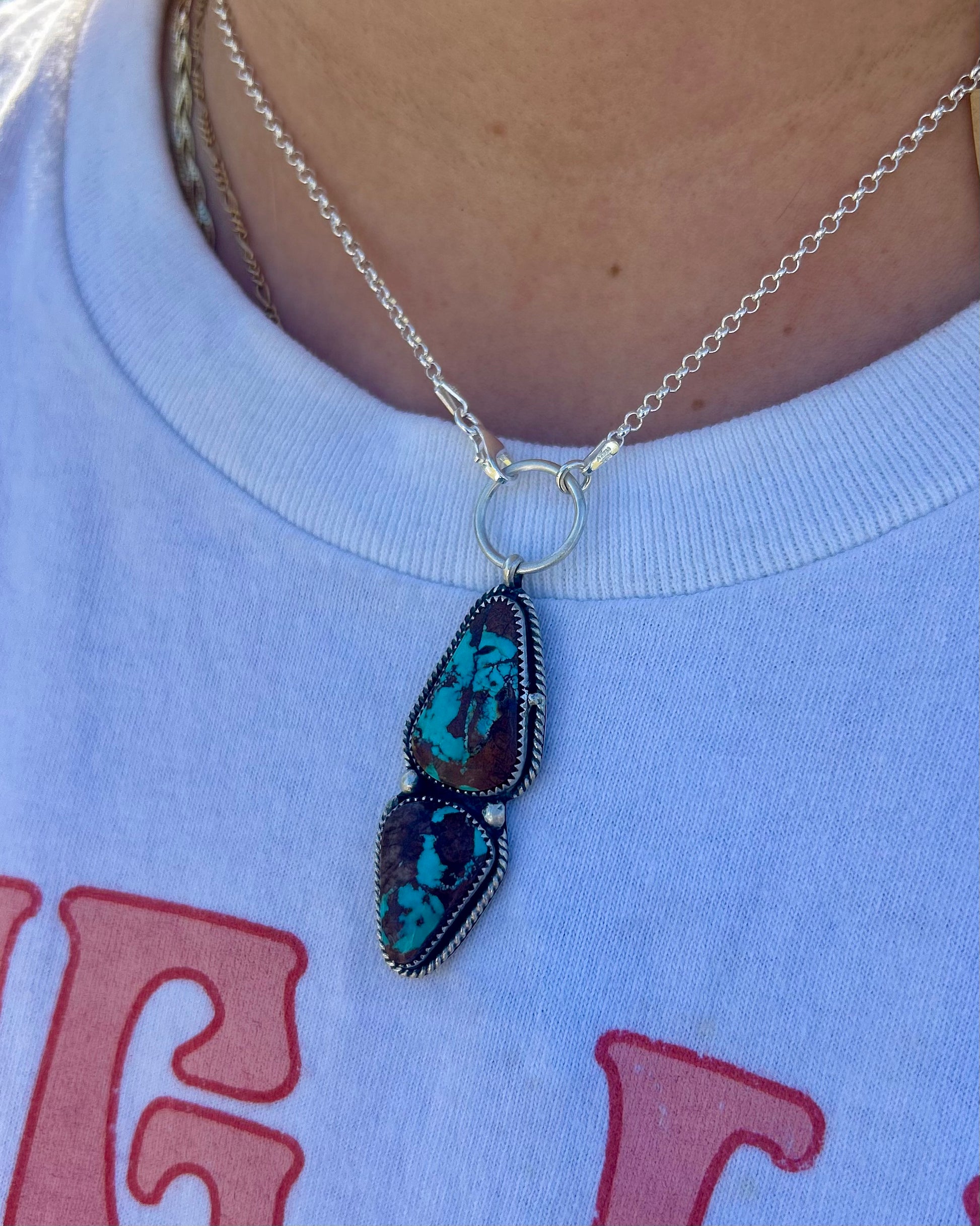Royston turquoise necklace on a 16” sterling silver chain with a front clasp