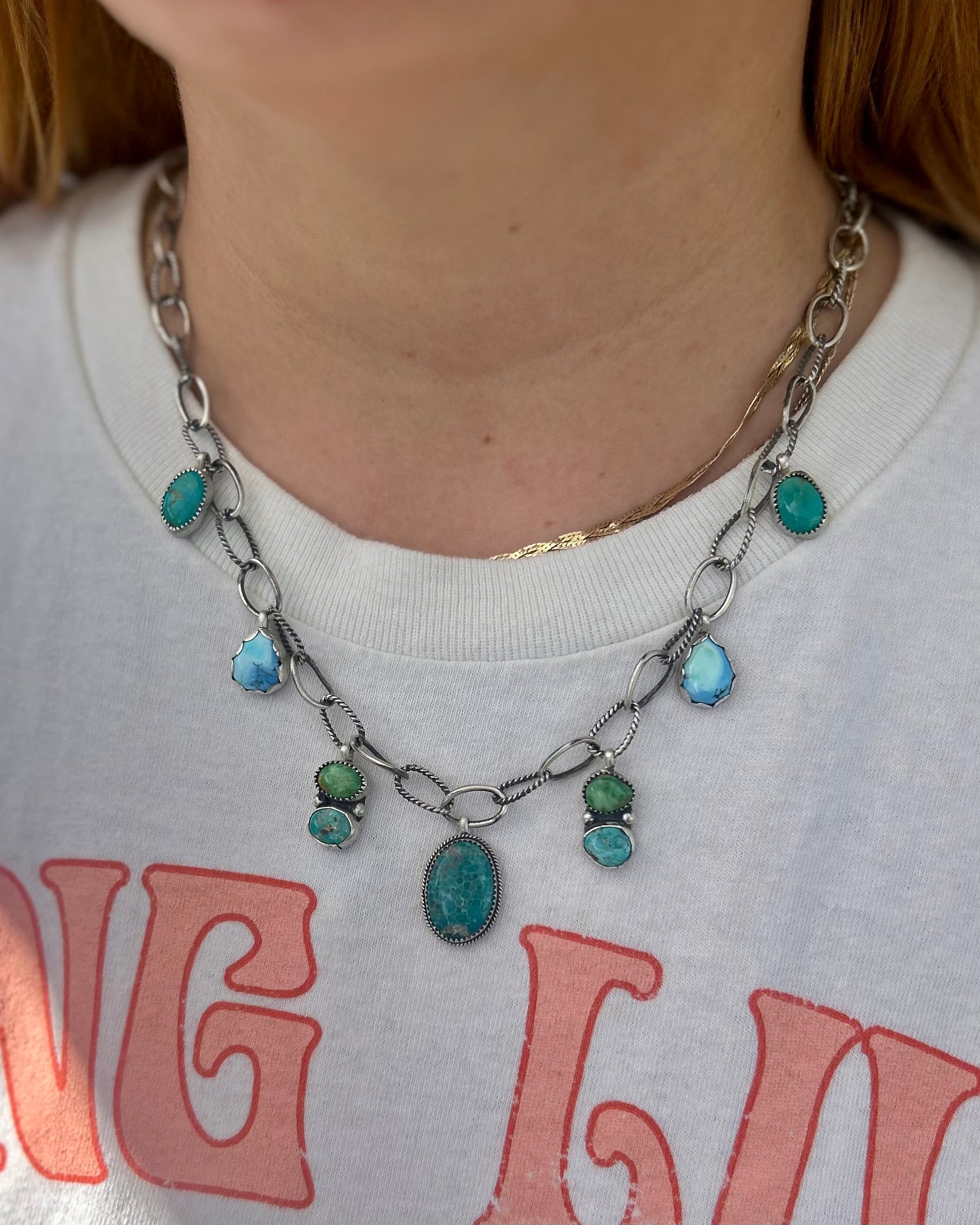 20" of handmade chain adorned with white water, emerald valley, cripple creek, golden hills, and sonora turquoise!